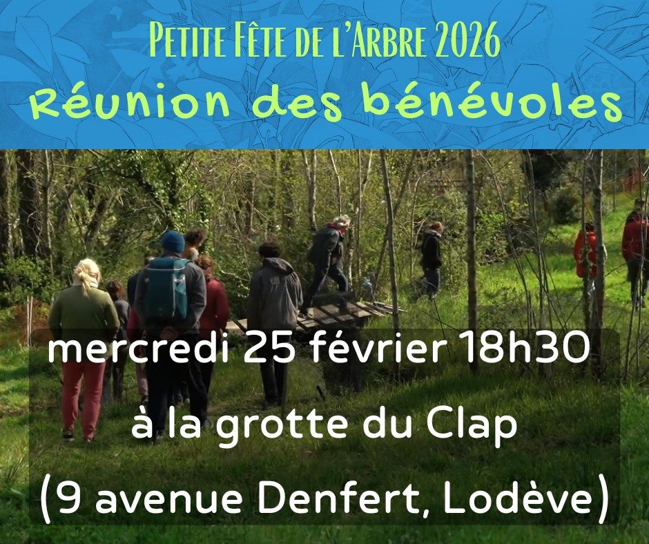 L’équipe Paysarbre est ravie de vous convier mercredi 25 février, à partir de 18h30 pour la réunion des bénévoles de la Petite Fête de l’Arbre, à la grotte du Clap (9 avenue Denfert, Lodève).😊